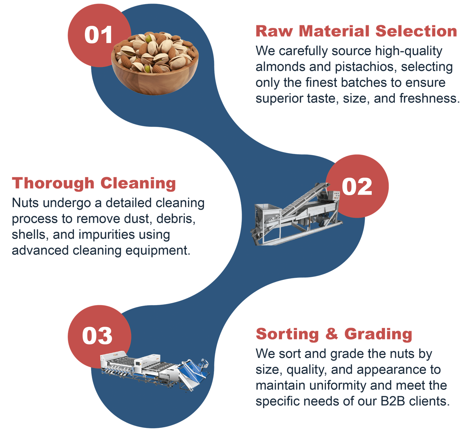 Professional-grade almonds and pistachios, cleaned and packaged to deliver consistent freshness, reliable purity, and dependable quality for businesses requiring excellence. From competitive pricing to year-round availability, we provide the reliability your operations demand.